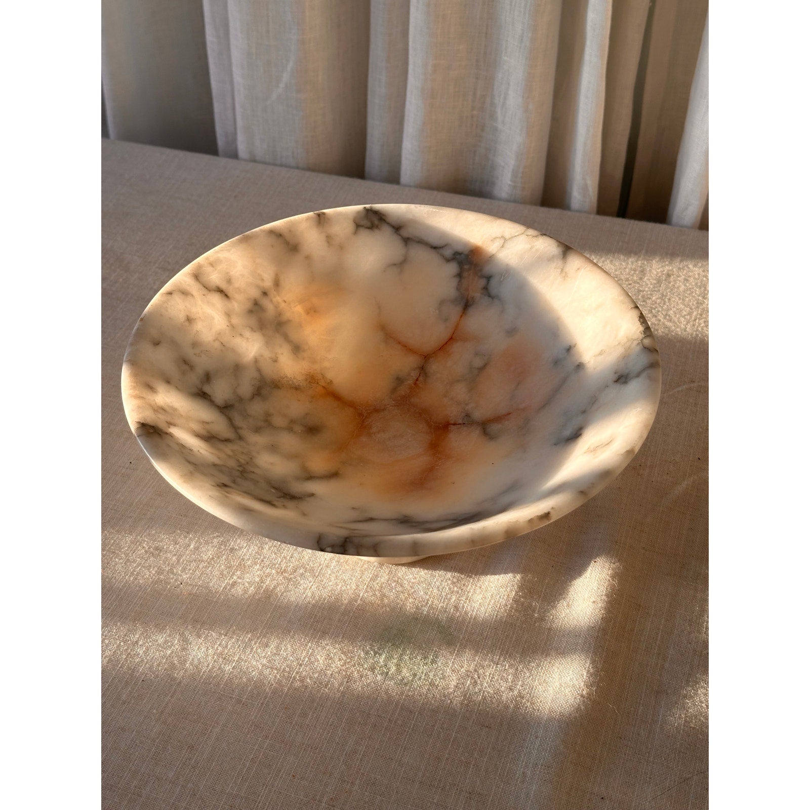 The bowl measures approximately 10 inches in diameter and 5 inches in height. It showcases the natural beauty of alabaster, with unique veining and a smooth, polished finish.
