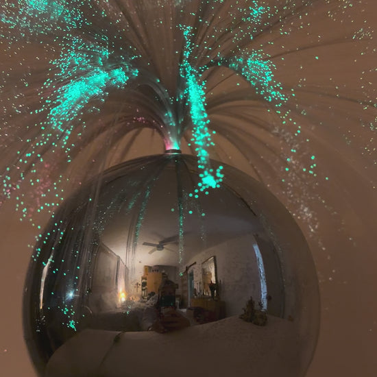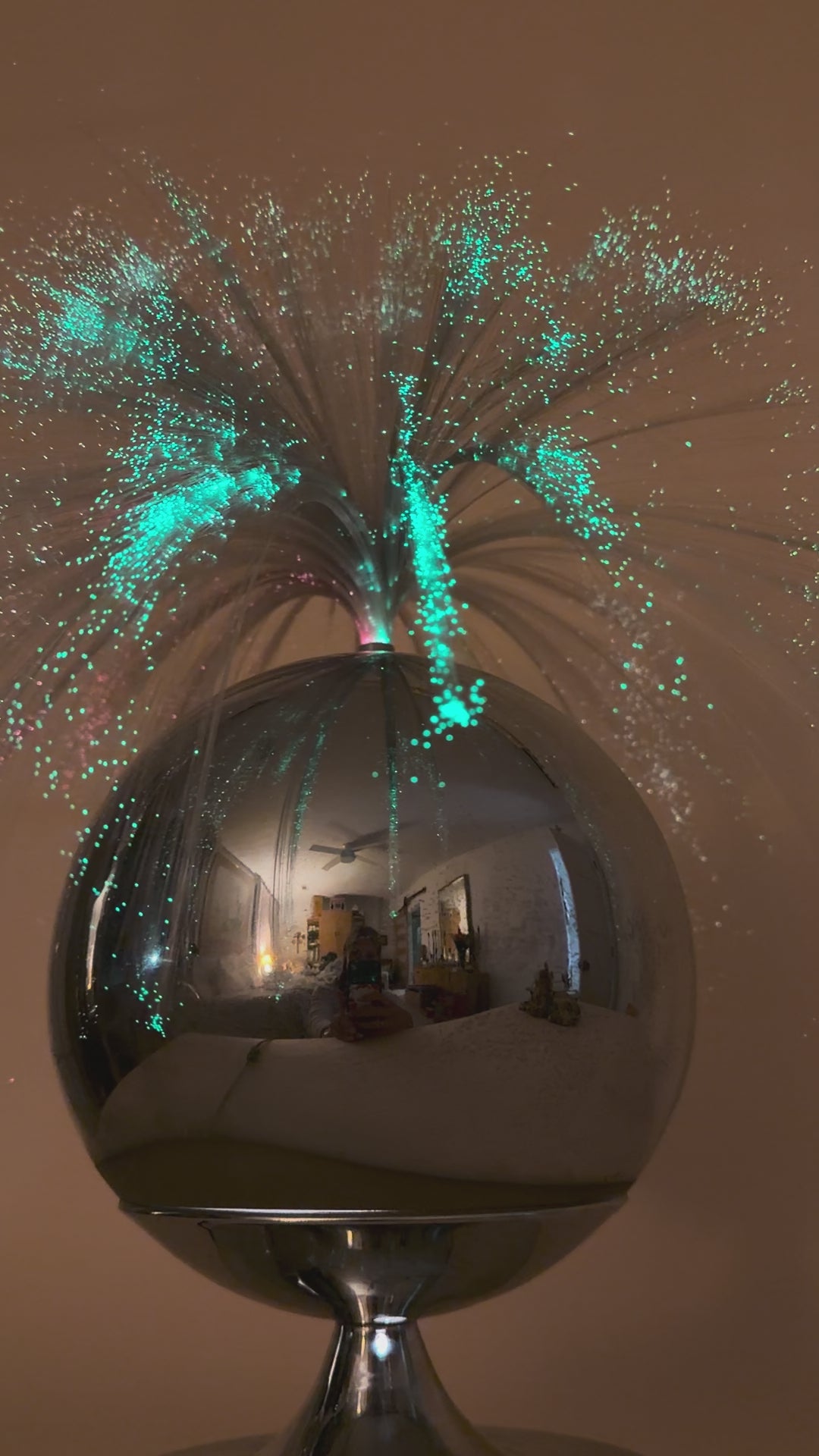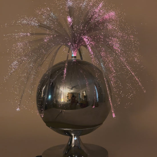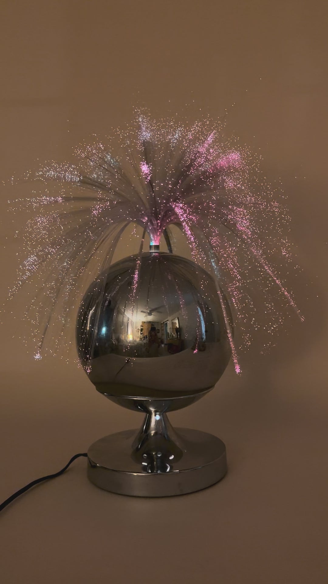 This Space Age beauty throws the dreamiest ambient glow — thousands of filaments light up and shift as the lamp rotates ever so slightly, giving that magical 1970s futurist mood. Chrome base and globe are wonderfully reflective, displaying beautifully with minimal surface wear consistent with age.